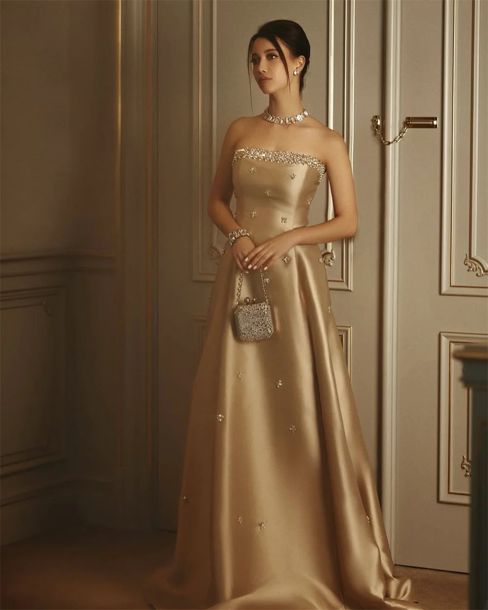 Contessa Dubai Champagne Gold A-line Glitter Prom Dresses Strapless Floral Customized فساتين سهرات Sweep Train robes de soirée